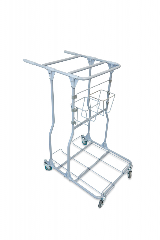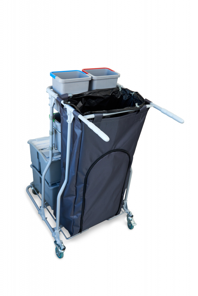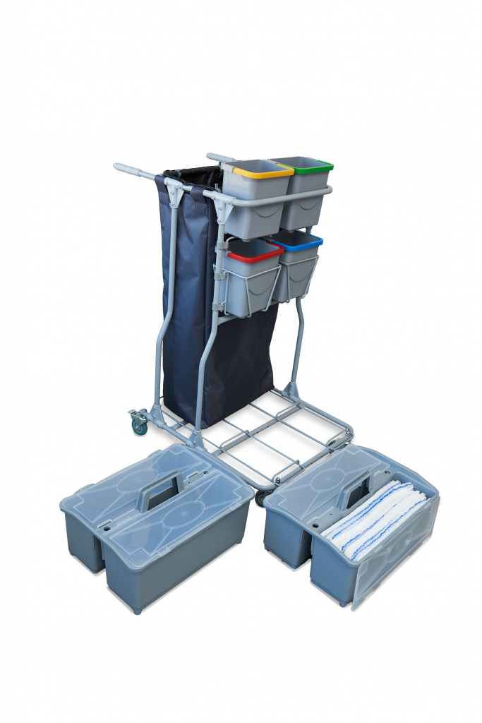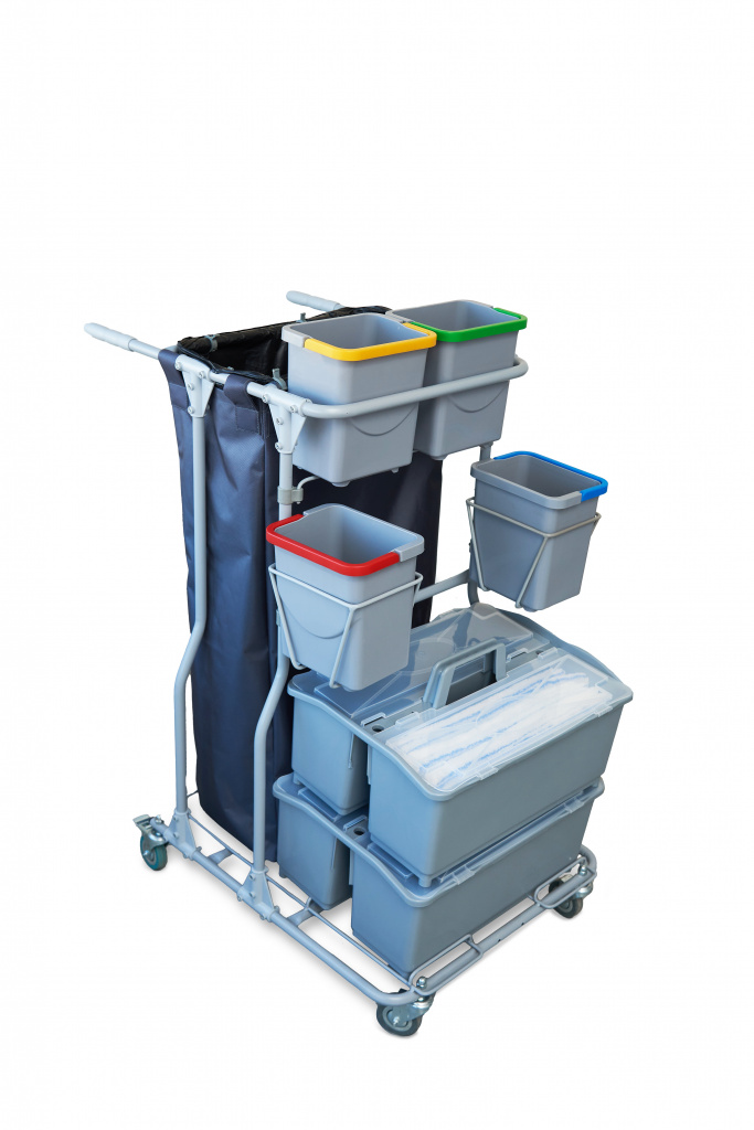 Элементы тележки собираются при помощи болтового соединения и пластиковых элементов. Сборно - разборная конструкция позволяет снизить издержки связанные с транспортировкой и складским хранением. В разобранном виде тележка занимает всего 45% от собранного состояния.Тележка комплектуется двумя 2х секционными ведрами с откидными крышками для складирования чистых или грязных мопов, и четырьмя ведрами объемом 4л для влажных салфеток или различных расходных материалов, инвентаря, химии. Верхний ряд малых ведер вынимается вертикально вверх, нижний ряд малых ведер устанавливается в металлические корзины, которые крепятся на двойные пластиковые петли, которые обеспечивают компактное размещение при этом сохраняют удобство использования малых ведер.